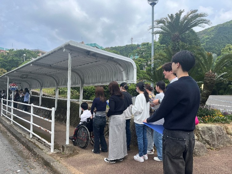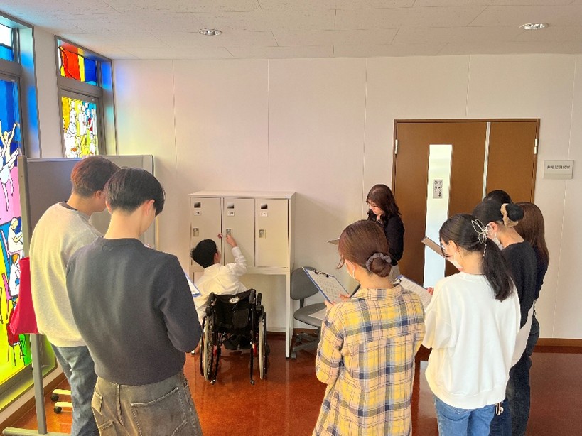 ケアワークコースの2年生は車いすユーザーの先輩と学内を散策したり、講義を聴いたりして車いすユーザーの大学生活について理解を深めました。