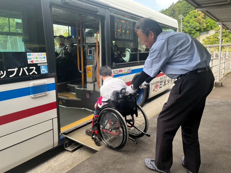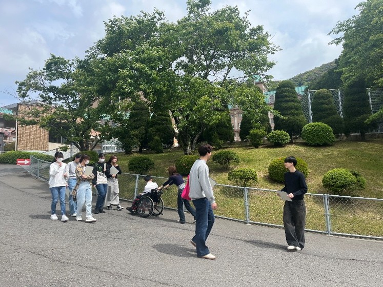 ケアワークコースの2年生は車いすユーザーの先輩と学内を散策したり、講義を聴いたりして車いすユーザーの大学生活について理解を深めました。
