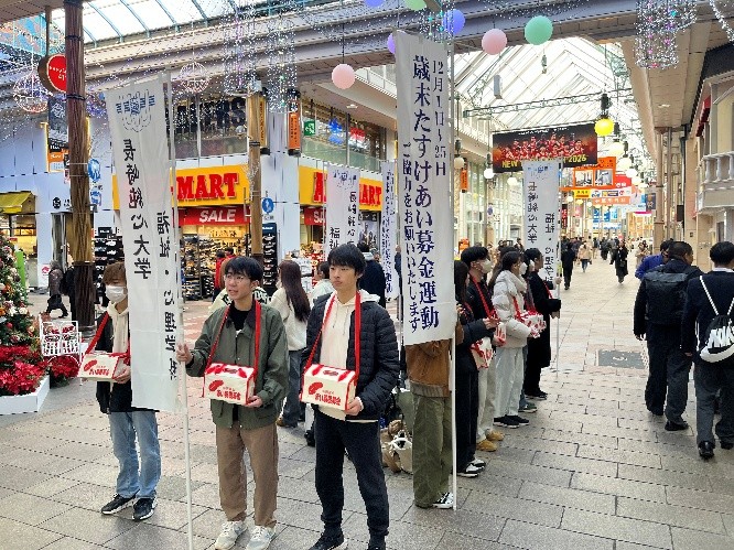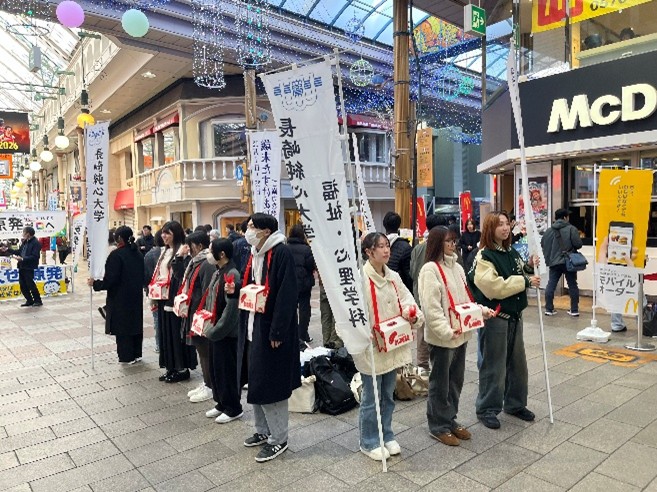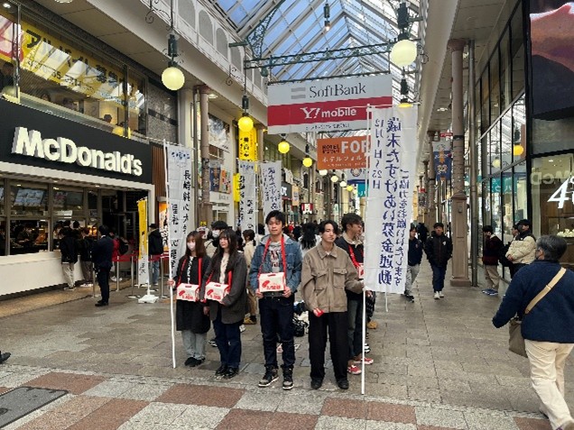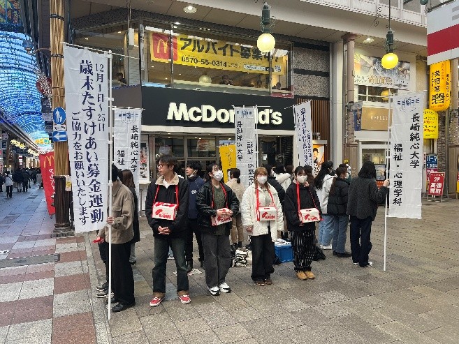 12月6日(土)、長崎市浜町アーケードにて、福祉?心理学科の1年生が「歳末たすけあい運動」の街頭募金活動を行いました。