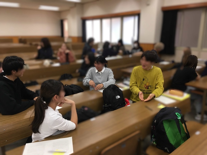 この日は複数の活動を行いましたが、まずは言葉を使わずに自分の意思を伝える体験をしてもらいました。これは、言葉がまだ十分に使えない時期の子どもが、大人に何かを伝えようとしている場面を追体験するための活動です。後で感想を聞いてみると、身振り手振りを頑張ったのに、簡単なことでも正確に伝えられないことのもどかしさを語ってくれました。言葉で意思を伝えることができない時、子どもがどんな気持ちを味わっているのか活動を通じて感じ取ることができたのではないでしょうか。改めて、言葉の便利さに気づいたり、まだうまく話すことができない時期の子どもが保育者に何かを伝えようとする際の苦労が想像できたのではないかと思います。