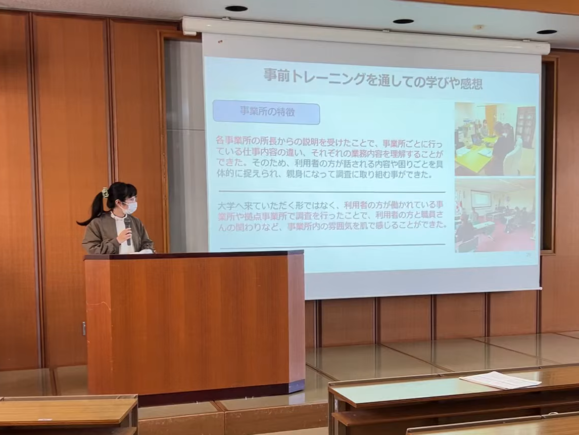 発表後には質疑応答が行われ、南高愛隣会の職員の方々から活発なご意見や感想が述べられ、質問に対して、学生が回答する場面も見られました。学生たちは、初めての発表に緊張しながらも意欲的に参加することができ、成長する機会となったようです。