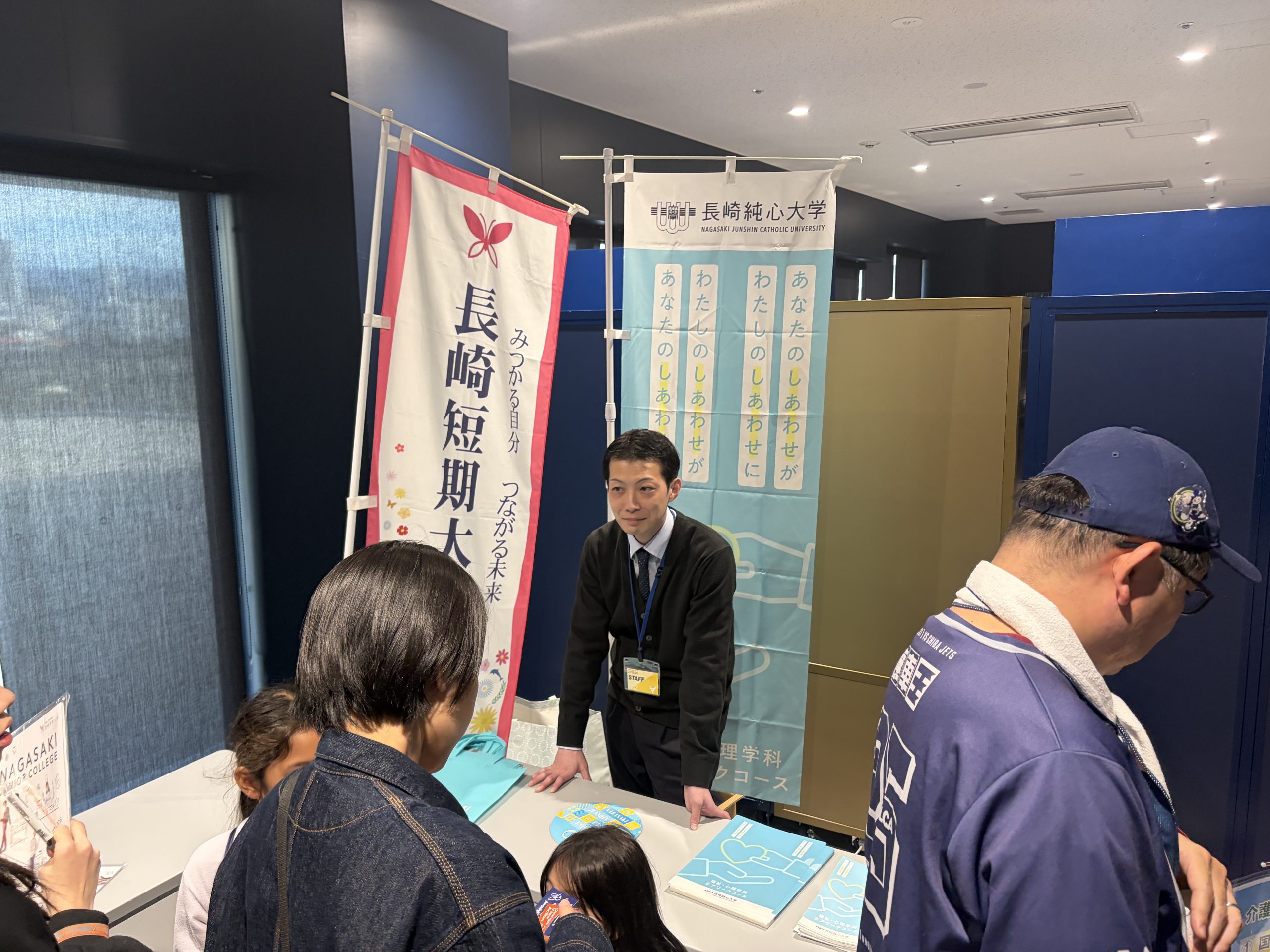 平日開催にもかかわらず、多くの来場者にブースに足を運んでいただき、本学の教育内容や福祉専門職養成について関心を寄せてくださいました。ブースでは大学パンフレットを活用し、特に介護福祉士養成を中心に、社会福祉士、精神保健福祉士、公認心理師など、本学で取得可能な資格や学びの特徴について説明を行いました。